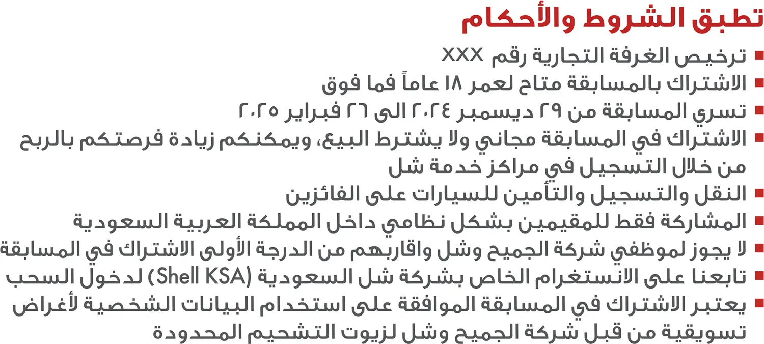 يعتبر الاشتراك في المسابقة الموافقة على استخدام البيانات الشخصية لأغراض تسويقية من قبل شركة الجميح وشل لزيوت التشحيم المحدودة